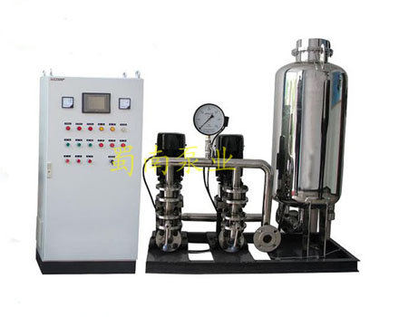 變頻供水設(shè)備采用氣壓式供水。利用密封罐體,利用罐內(nèi)高壓氣水壓力達到供水目的。具體工作順序是由水泵將水通過逆止閥壓入罐體,使罐內(nèi)氣體受到壓縮,壓力逐漸增大。當(dāng)壓力達到指定上限時電接點壓力表通過控制柜使泵機自動停止。設(shè)備中的水壓高于外界管網(wǎng)壓力,自動送水至供水管網(wǎng)。當(dāng)罐體內(nèi)水位下降,罐內(nèi)氣體膨漲壓力減小到指定的下限位置時,電接點壓力表通過控制柜使水泵重新啟動。如此反復(fù),使設(shè)備不停供水。當(dāng)罐內(nèi)氣體不足時,補氣閥可自動補氣。